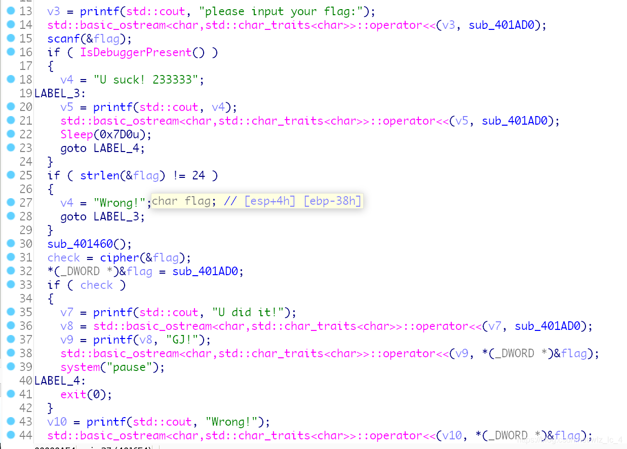 check函数: .text:00401090这里是先对flag进行的处理,然后进入cipher函数,base64编码下,后面是和一个写好的密文对比